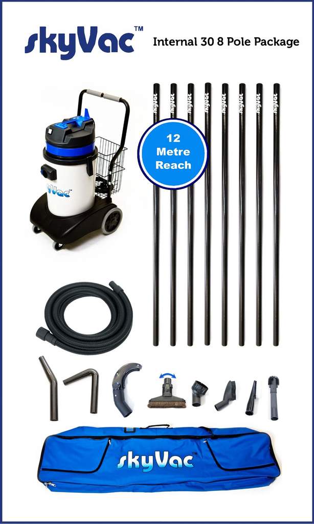 Relevant poles and nozzles attached to the vacuum, with a Wireless camera and inspection monitor, to make vacuuming gutters clean & safe from the ground.